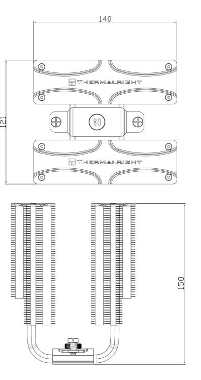 מפרט גוף קירור: מידות: אורך 140 מ"מ x רוחב 121 מ"מ x גובה 158 מ"מ משקל: 1000 גרם צינורות חום: צינור חום בקוטר 8 מ"מ 5 x יחידות סנפירים: עובי = 0.4 מ"מ; מרווח = 1.8 מ"מ בסיס נחושת: נחושת טהורה C1100 מצופה ניקל